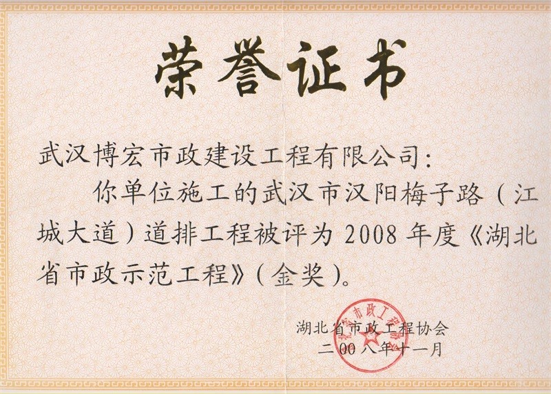 2008年度湖北省市政示范工程金奖(梅子路道排工程)