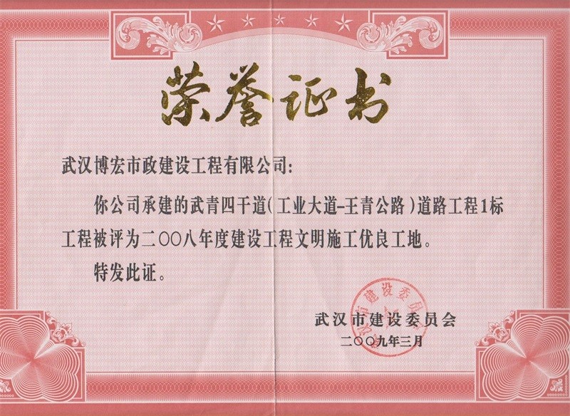 2008年度武汉市建设工程文明施工优良工地(武青四干道道路工程一标)